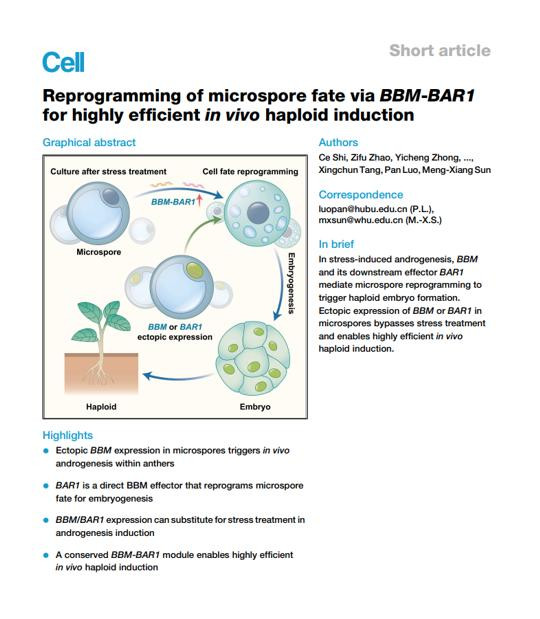 9月3日,贵州师范大学生命科学学院院长孙蒙祥教授的《ReprogrammingofmicrosporefateviaBBM-BAR1forhighlyefficientinvivohaploidinduction》(中文名称:《通过BBM-BAR1重编程小孢子发育命运实现高效体内单倍体诱导》)论文在国际顶级期刊《Cell》上刊发。研究成果揭示了小孢子命运重编程的关键分子机制,在单倍体育种技术领域取得了重要突破。